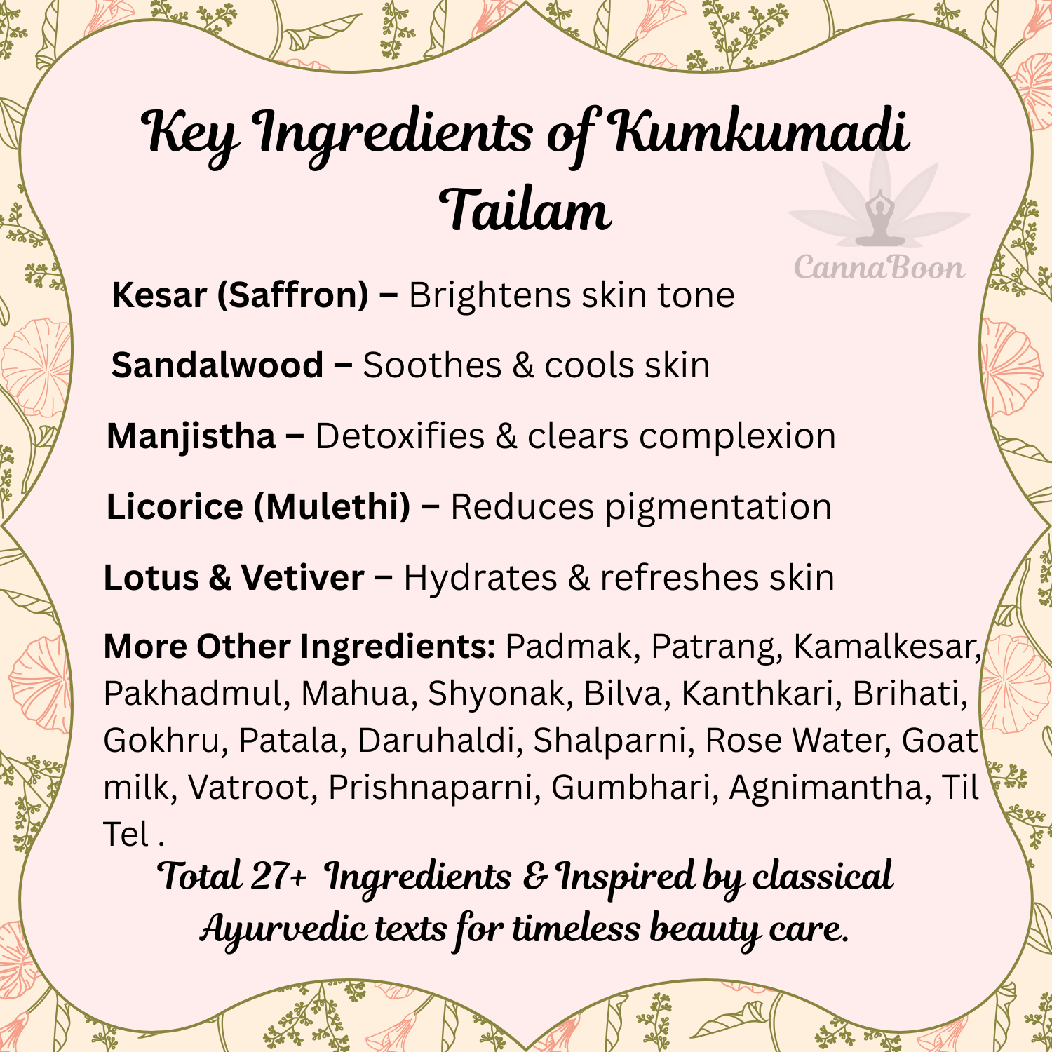 - QUALITY INGREDIENTS: Made up of premium ingredients like saffron, Red & White sandalwood, Manjistha & goat milk, etc (Total 27+ Ingredients) in this Kumkumadi oil.